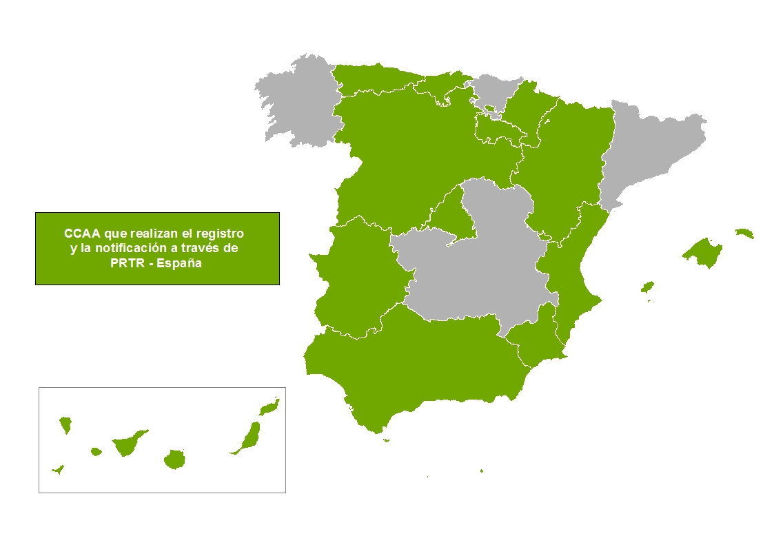 Los complejos industriales ubicados en las comunidades autónomas de Cataluña, Castilla la Mancha, Galicia y País Vasco deben notificar según los procedimientos establecidos en cada una de ellas. Comunidad Valenciana y Aragón han empezado a utilizar PRTR-España a partir del ciclo 2013 (datos 2012) y 2016 (datos 2015), también lo han hecho las comunidades autónomas de Andalucía, Castilla y León y Navarra desde el año 2020 (datos 2019).